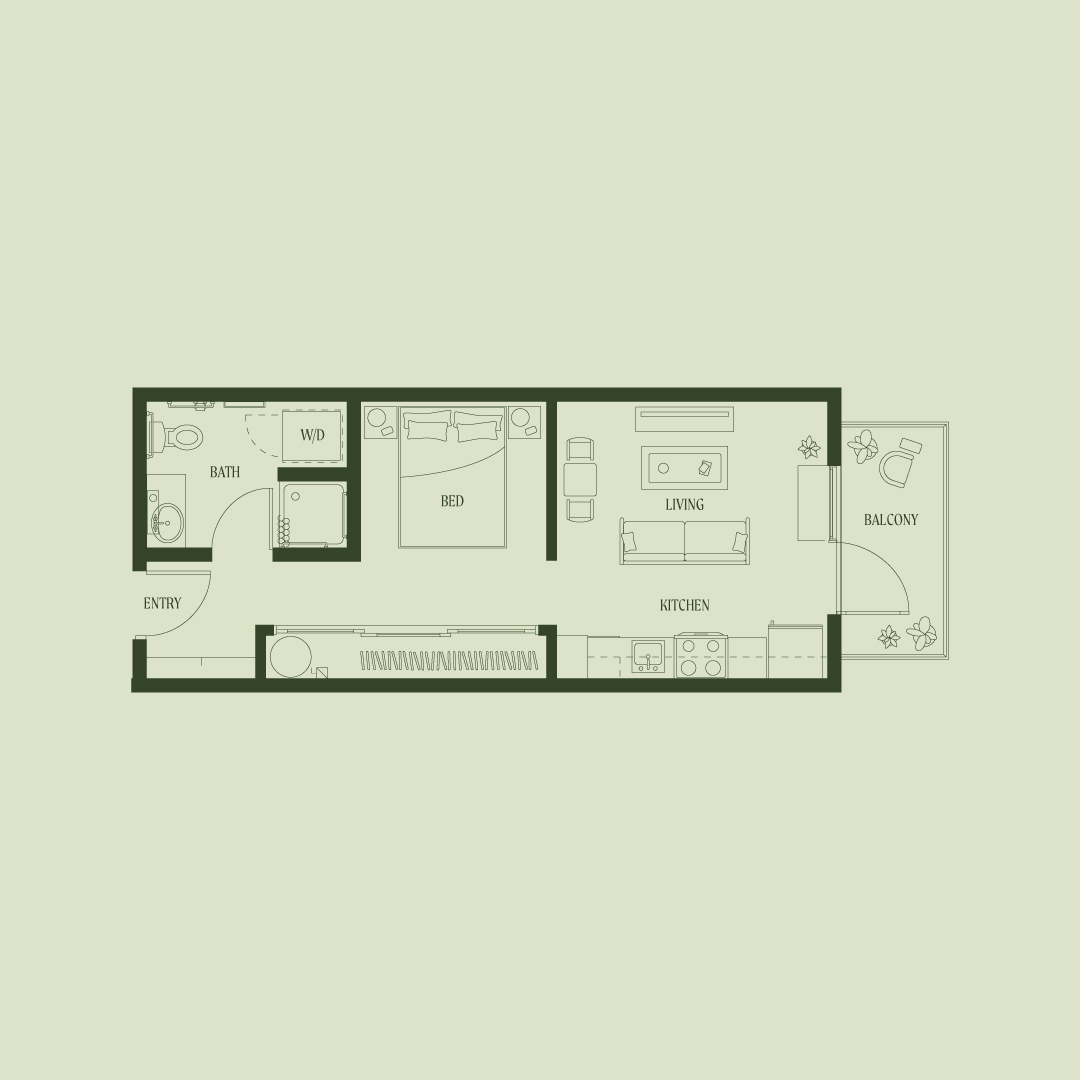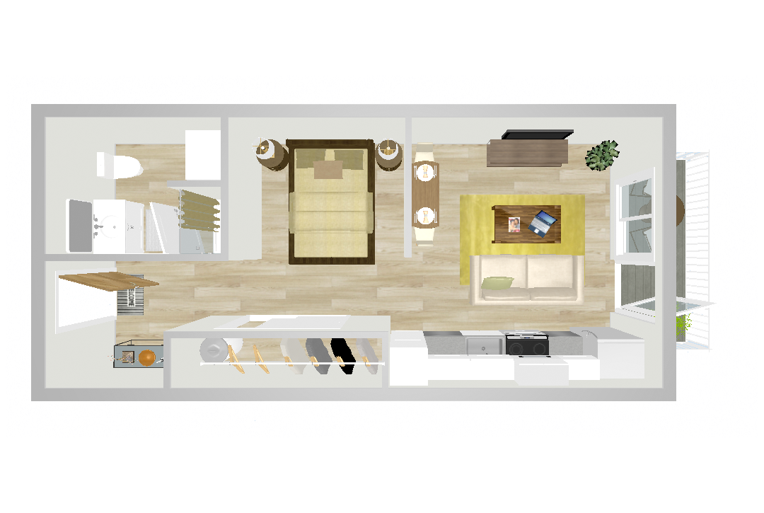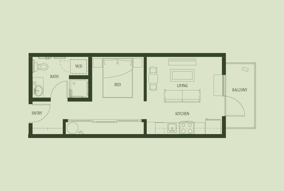 The junior one-bedroom offers a defined sleeping area while maintaining an open, airy feel. It’s an ideal choice for residents who want a bit more privacy and separation within a compact footprint.